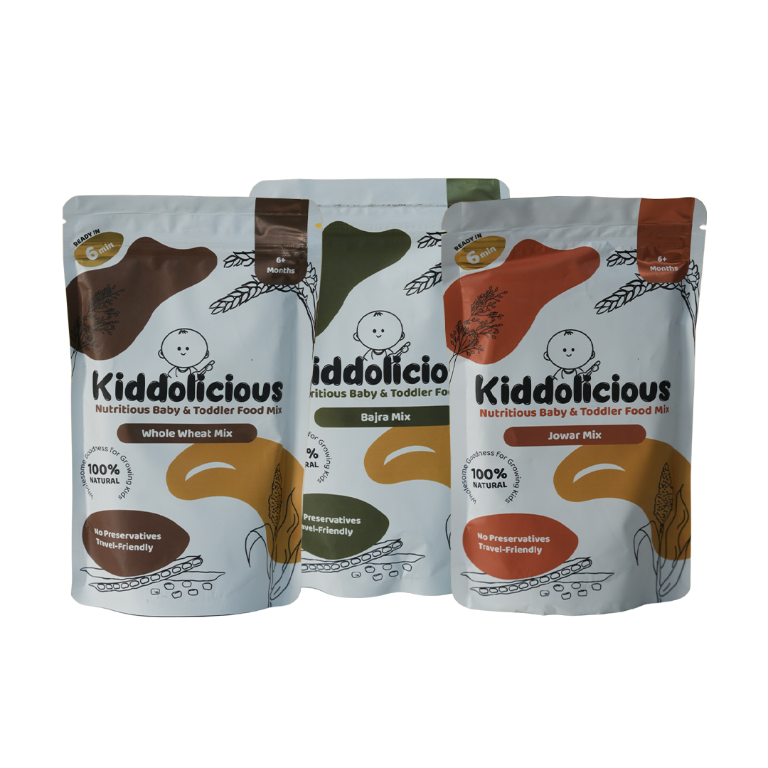 Give your baby the perfect start with the Kiddolicious Combo Pack featuring Jowar Mix, Whole Wheat Mix, and Bajra Mix. Each of these nutrient-rich blends is crafted for babies 6+ months, offering over 9 natural ingredients to help promote digestion, growth, and immunity.