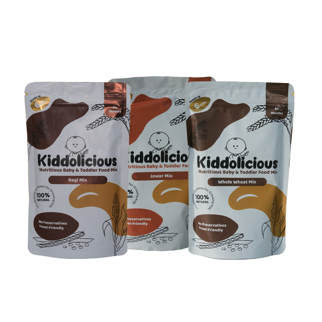 Give your little one a healthy start with the Kiddolicious Combo Pack featuring Ragi Mix, Jowar Mix, and Whole Wheat Mix. Designed for babies 6+ months, this trio combines over 9 natural ingredients in each mix to deliver the essential nutrients for healthy digestion, growth, and immunity.